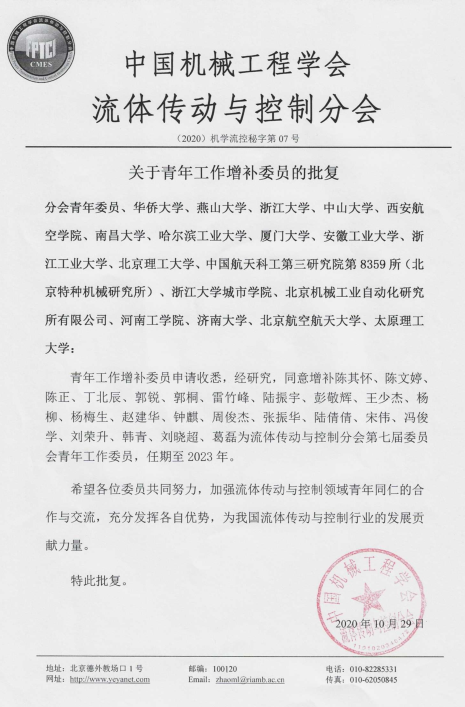 我院教师刘荣升博士经《中国机械工程学会流体传动与控制分会》批复,受聘为第七届委员会青年工作委员,任期至2023年。
