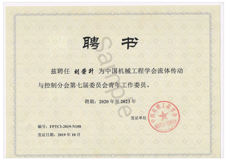 鉴于刘荣升博士在流体传动与控制领域所作出的努力和取得的成绩,被学会批复成为第七届委员会青年工作委员,以鼓励其为我国流体传动与控制行业的发展贡献更多力量。