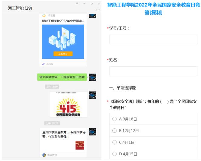 22年4月15日是《中华人民共和国国家安全法》颁布实施以来的第七个全民国家安全教育日。今年的活动主题是“树牢总体国家安全观,感悟新时代国家安全成就,为迎接党的二十大胜利召开营造良好氛围”。我院积极进行组织规划,结合当前疫情防控形势和学校实际,通过开展线上答题和宣讲等活动等形式切实开展国家安全教育学习。