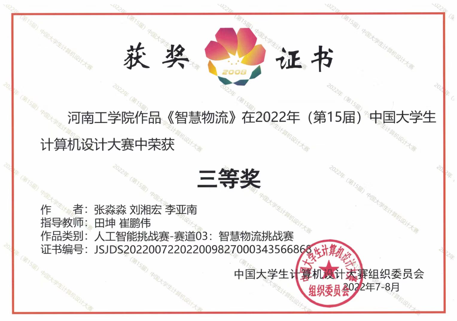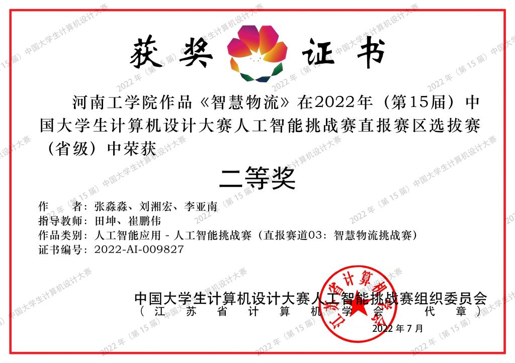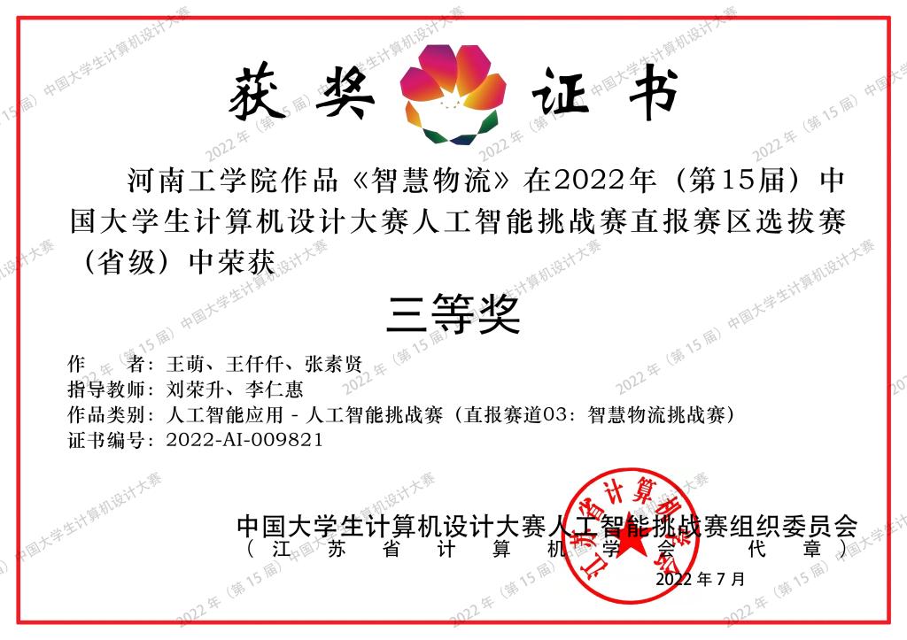 近日,2022年(第15届)中国大学生计算机设计大赛全国总决赛落下帷幕,经过激烈角逐,我院学生张淼淼、李亚南、刘湘宏的作品《智慧物流》获得人工智能挑战赛类三等奖,实现该赛项成绩的新突破。
