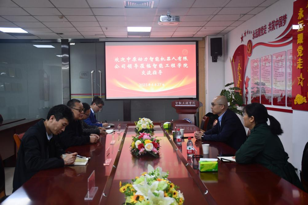 2023年4月27日上午,中原动力智能机器人有限公司联合创始人兼CEO林杰,人事部经理袁薇莎来我院交流合作事宜。学院党委书记郑峰、院长杜志勇、副院长杨富超等人陪同调研并座谈交流。