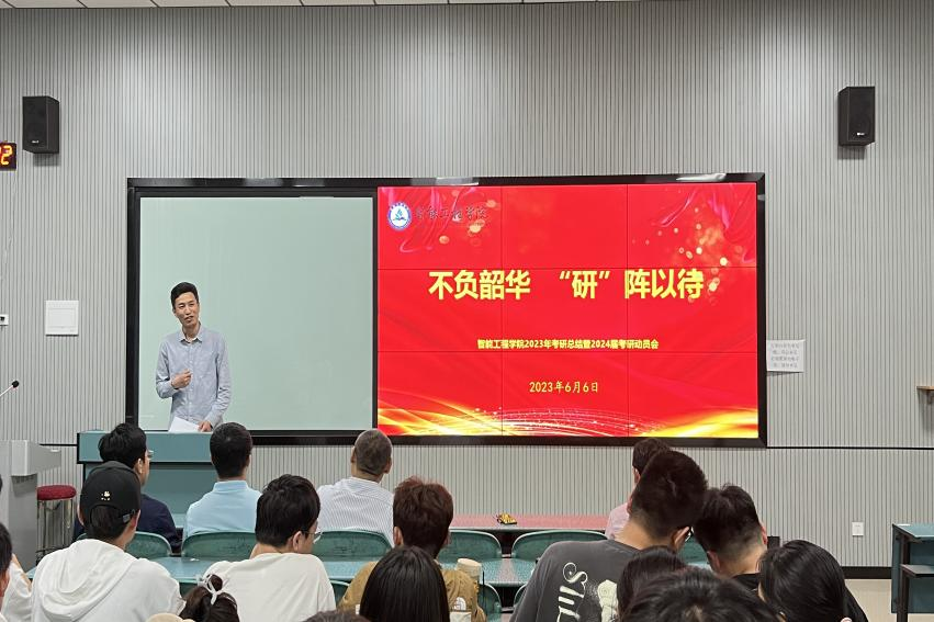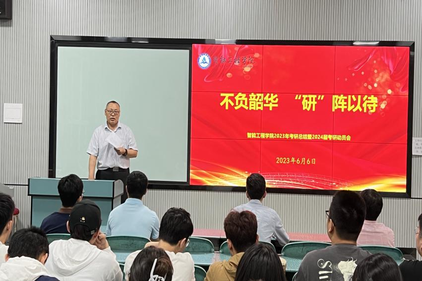 为进一步激发同学们的考研热情,掌握考研技巧,增强信心,营造优良学风,6月6日晚上7:30,智能工程学院在教1楼A103举办了2023年考研总结暨2024届考研动员会。智能工程学院书记郑峰、院长杜志勇、副书记王海燕、副院长杨富超、机器人教研室主任迟明路、人工智能教研室主任刘荣升、辅导员宋冲冲及考研班班主任王奕森出席了本次活动,大会由副书记王海燕主持。