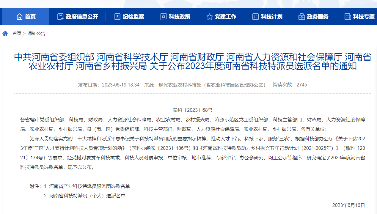 2023年度河南省科技特派员选派名单已经在科技厅网站公示