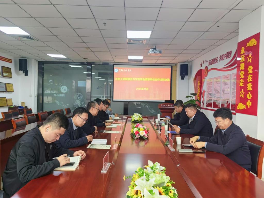 2024 年 11 月 1 日下午,河南工学院联合办学董事会董事单位:河南省志方起重设备有限公司总经理董志方、河南恒远恒山工业有限公司总经理朱明于、新乡日升数控轴承装备股份有限公司副总经理穆雪健等一行来我院交流合作事宜,学院领导班子和部分教师代表参加座谈交流。