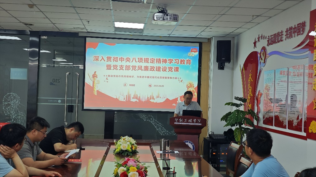 2025年6月5日,为深入贯彻落实党中央关于全面从严治党的决策部署,进一步巩固和拓展党的作风建设成果,推动党风政风持续向好,一场以“深入贯彻中央八项规定精神学习教育暨党支部党风廉政建设”为主题的专题党课在创新楼210成功举办。本次党课由支部书记杨富超主讲,旨在通过系统学习中央八项规定精神,增强党员干部的纪律意识和规矩意识,为推进中国式现代化提供坚强作风保障。