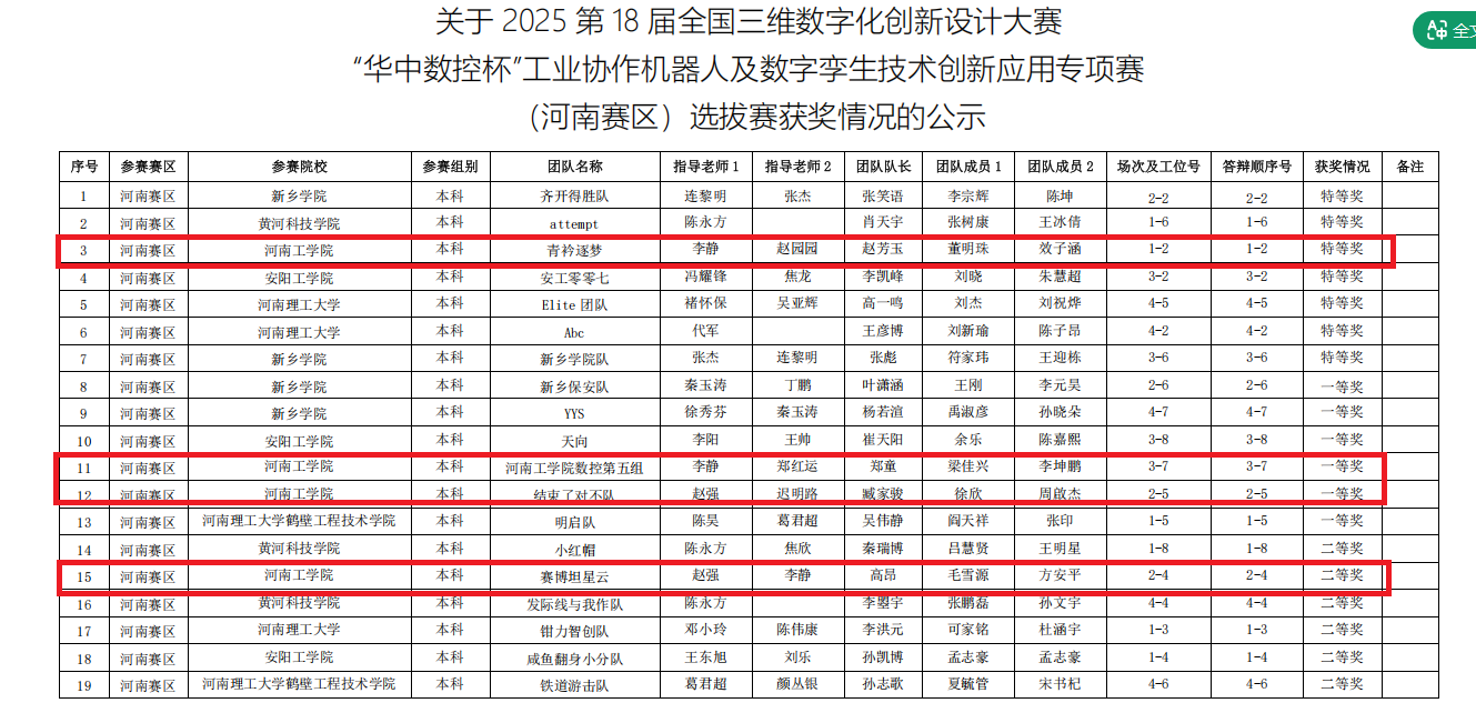 2025年6月12日,第18届全国三维数字化创新设计大赛“华中数控杯”工业协作机器人及数字孪生技术创新应用专项赛(河南赛区)在河南理工大学圆满落幕。河南工学院智能工程学院选派五支代表队参赛,凭借出色的技术创新与实践能力,斩获特等奖1项、一等奖2项、二等奖1项、三等奖1项的优异成绩,展现了学校在智能制造领域的教学实力与人才培养成果。