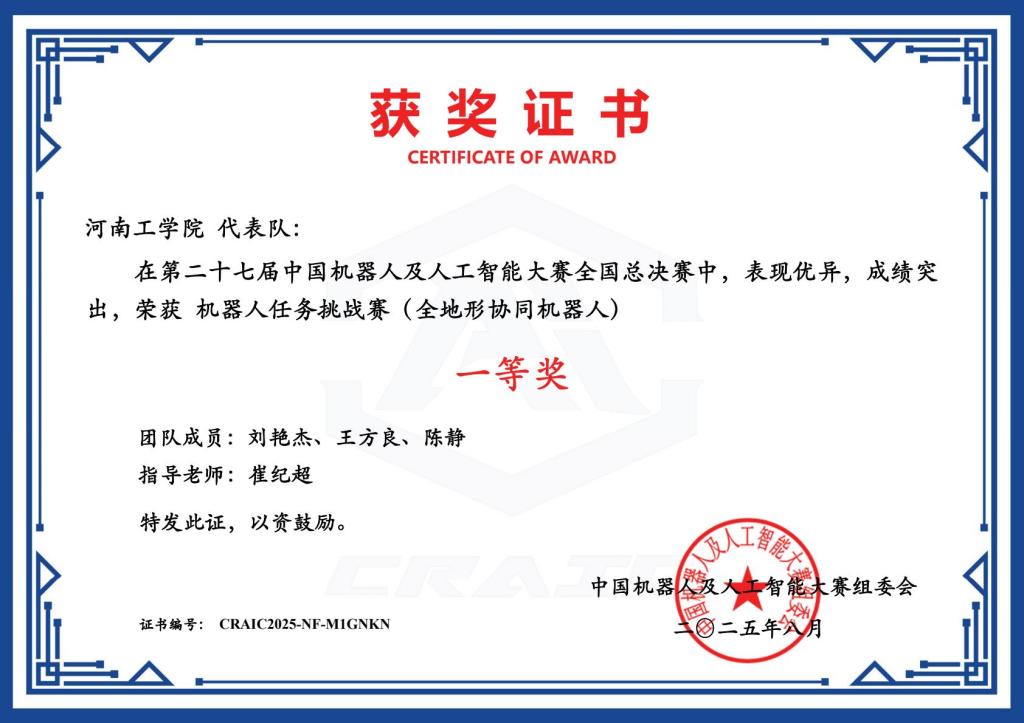 本届大赛对全地形自适应机器人设计赛项进行全面升级,重点考核机器人的多地形适应、自主导航、精准作业和多机协同能力。我院共组建“豫工梦想家队”(刘艳杰、王方良、陈静)、“河工智联战队”(屈腾龙、赵永栋、楚雨涵)二支队伍,其中“豫工梦想家队”以国赛线上选拔赛与线下总决赛中两次夺魁,最终以总分第一的优势摘得全地形协同机器人任务挑战赛全国冠军。