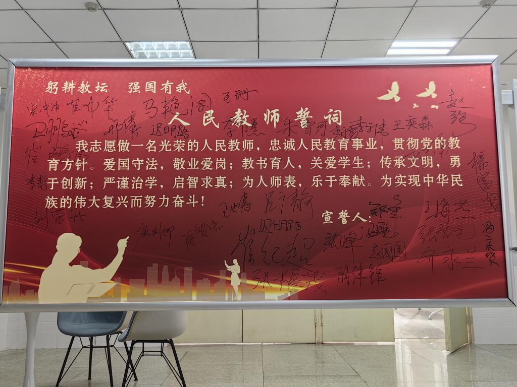 活动中,老中青三代教师代表纷纷上台分享了各自从教的经历和心得,其中新教师赵园园分享了她的教育心路历程;卫鹏斌老师讲述了他在教学实践中坚守师德的经验与感悟;崔纪超老师分享了在担任班主任时所遵循的“陪护流程”;张智先老师讲述了自己多年来始终坚持“学生为中心”的教学理念。随后,在杨富超副院长的引导下,全体教职工回归初心,重温教师誓词并对其进行庄严的宣誓,同时签下了自己的名字作为承诺。