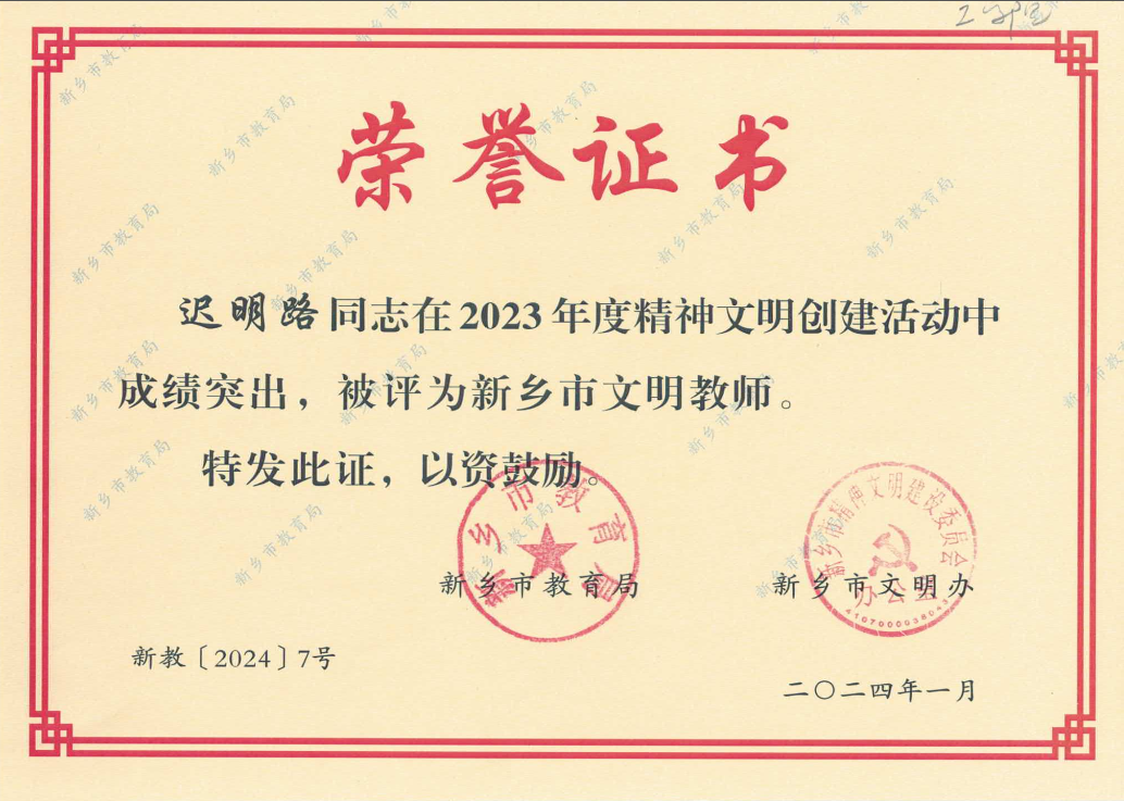 近日,为表彰先进,树立典型,进一步激发广大师生员工精神文明创建热情,新乡市教育局、新乡市文明办公布了2023年度全市教育系统“两创两争”活动先进集体和先进个人评选结果,经民主推荐、资格审查、专家评审和公示等环节,我院迟明路老师被评为2023年度新乡市文明教师。