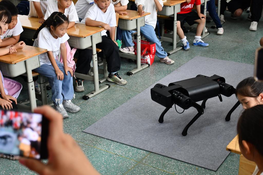 “猜字谜”互动环节更是将氛围推向高潮,学生们化身“学霸”,竞相争夺“AI体验官”荣耀,成功者得以与机器狗亲密互动,直呼过瘾。志愿者们则以风趣幽默的方式,深入浅出地讲解人工智能的奥秘,让科技之光照亮孩子们的心灵。