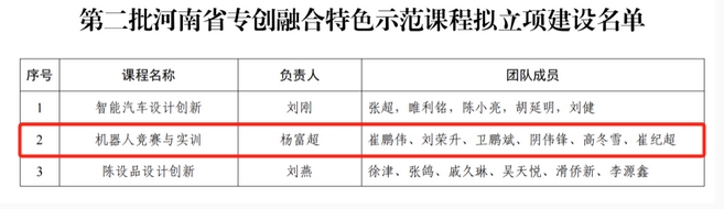 4月22日,省教育厅公示了第二批河南省“专创融合”特色示范课程立项建设名单,我院申报的《机器人竞赛与实训》课程拟获批立项建设。