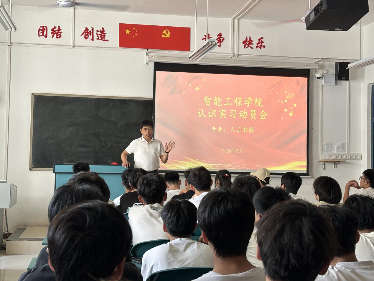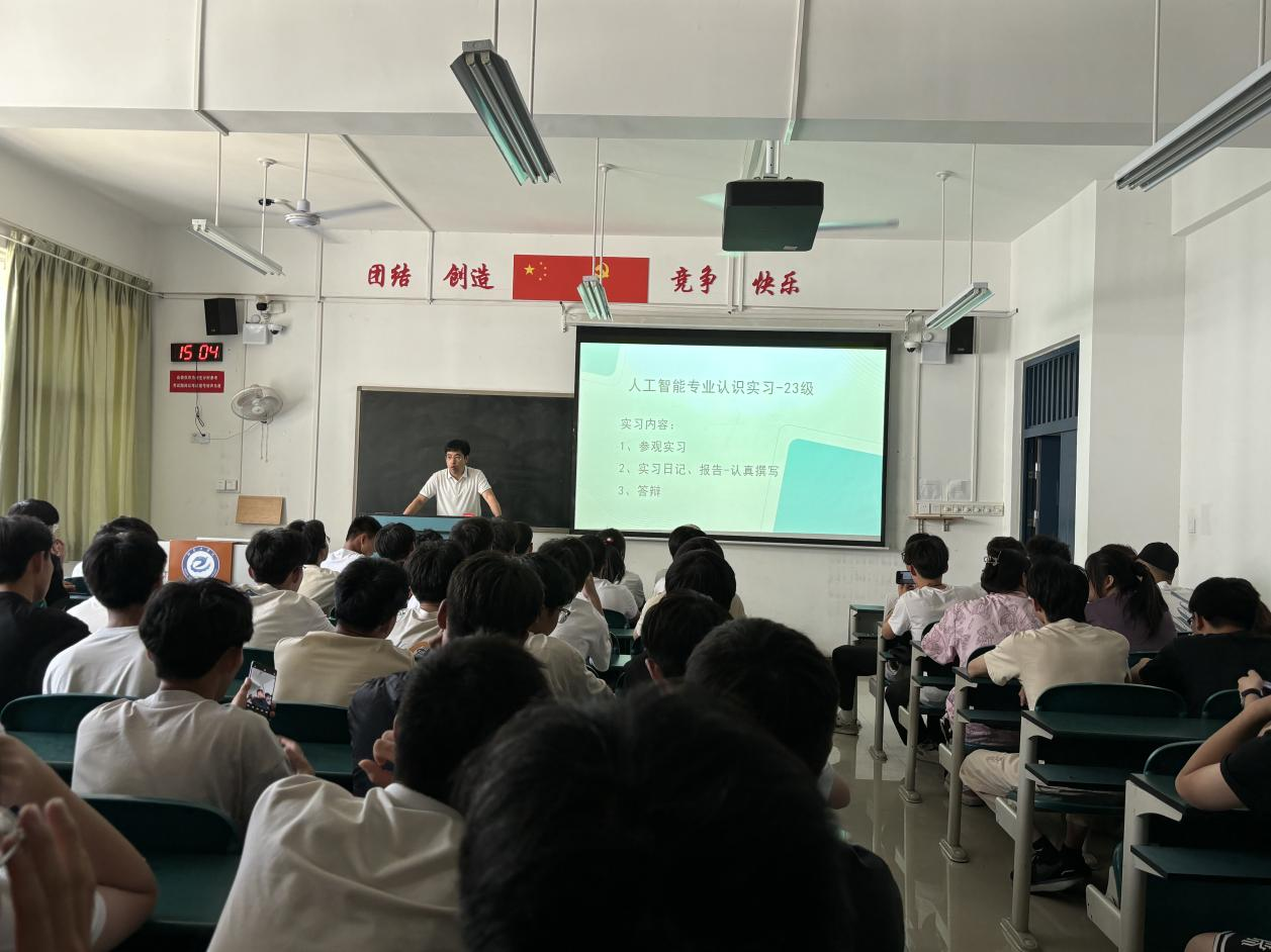 本次动员针对2023级人工智能专业的101名学生开展,结合应用型人才培养体系结构强调了专业认识实习在4年培养过程中的作用和重要性,介绍了从5月13日至5月17日为期5天的参观流程和具体的实习内容,引导学生深入了解人工智能专业的发展趋势以及结合行业的应用前景,激发学生对专业的学习兴趣,并通过参观校内人工智能基础实验室、机器视觉实验室以及智能机器人实验室拓宽 AI+应用的认知。实习过程还规划了智慧岛、大数据科技园以及裕东鑫正电子技术有限公司等多家与人工智能紧密相关的企事业单位进行校外参观实习。