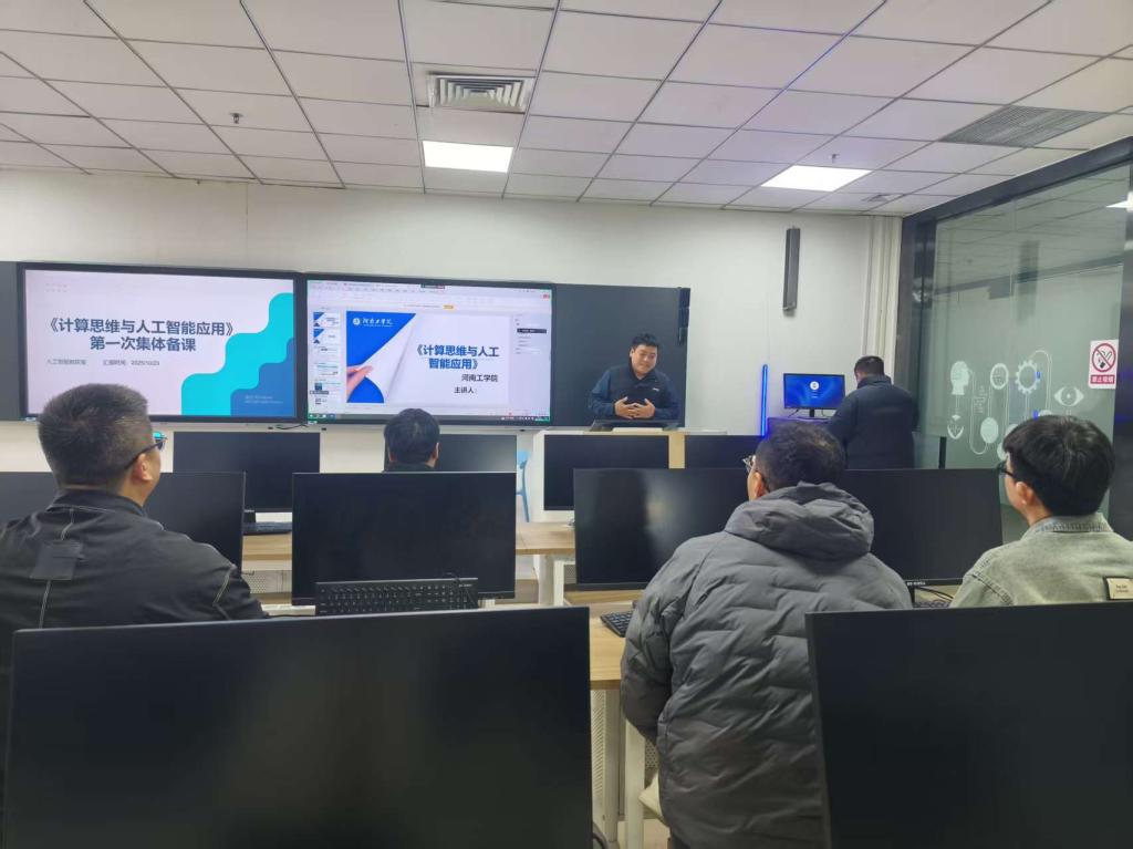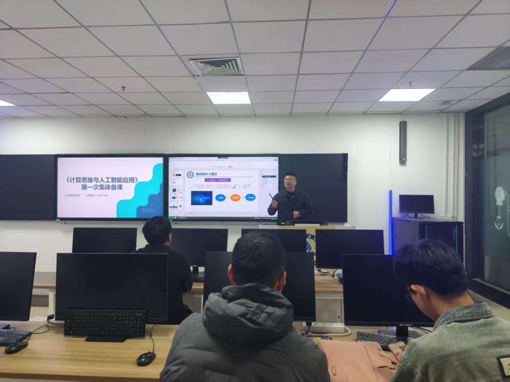 2025 年 10 月 23 日,面向全校全体本科班的人工智能通识核心课程《计算思维与人工智能应用》课程组,在创新楼 202 教室以线上线下深度融合的模式开展首次集体备课。本次备课以“破解教学难点、统一育人共识、规范教学标准” 为核心,围绕课程定位与育人目标、课程体系与章节逻辑、重点章节知识点与教学方法、督导专家听课意见落实四大模块展开深入研讨。作为覆盖全专业本科生的人工智能通识课,其核心使命不仅是普及技术知识,更要培养学生适应智能社会的核心素养,为新质生产力发展储备具备跨学科视野与社会责任感的复合型人才。