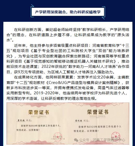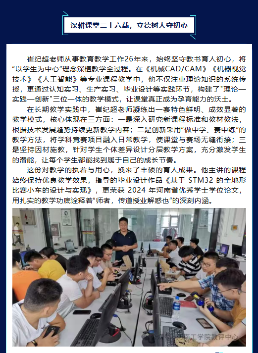 近日,河南工学院教评中心推出“师者星光”专栏,讲述和宣传优秀教师的教育故事与执教情怀,智能工程学院崔纪超老师的先进事迹,在全校进行了展示和推广示范。他深耕工程实践教育二十六载,始终秉持“以赛促学、以赛促教、以赛促创”理念,以学科竞赛为抓手,构建“兴趣引导—技能锤炼—创新突破—成长成才”的全链条育人体系,累计指导学生斩获国家级荣誉31项、省级荣誉48项、校级荣誉4项,培育出一批“专业扎实、创新突出、发展后劲足”的高素质应用型人才,用坚守与创新诠释新时代高校教师的使命与担当,成为学院乃至全校学科竞赛领域的标杆引领者。