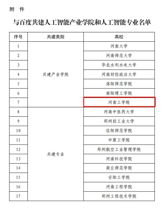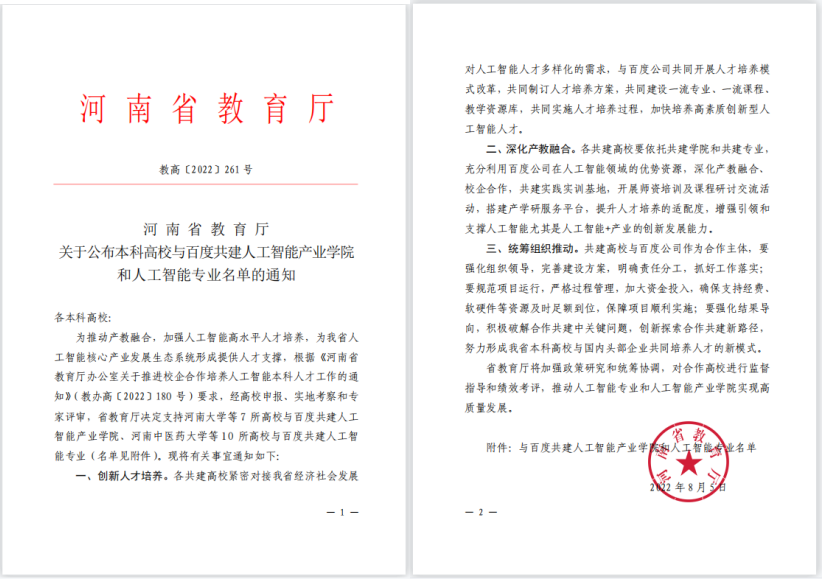 近日,河南省教育厅下发了《关于公布本科高校与百度共建人工智能产业学院和人工智能专业名单的通知》(教高〔2022〕261号),我校与百度共建人工智能产业学院成功获批。