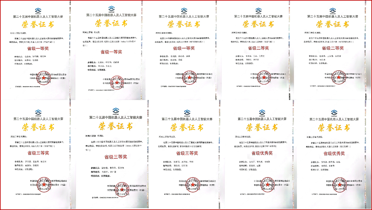 2023年5月27日,第25届中国机器人及人工智能大赛河南省赛在河南大学(金明校区)成功举行。智能工程学院学科竞赛团队,在智能驾驶、Aelos人型标准平台、城市道路识别等赛项中努力拼搏,过关斩将,获得河南省3项一等奖、2项二等奖,3项一等奖、2项优秀奖的佳绩。
